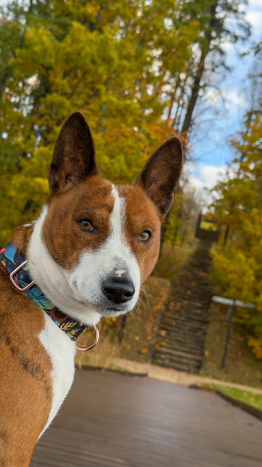Gebo wearing personalised "falling leaves" collar